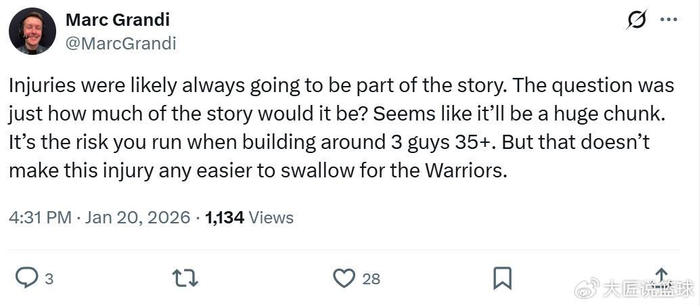 正如湾区记者Marc Grandi所说:“当你围绕三个35岁以上的球员建队时,伤病似乎注定会成为故事的一部分,这就是你必须承担的风险。”