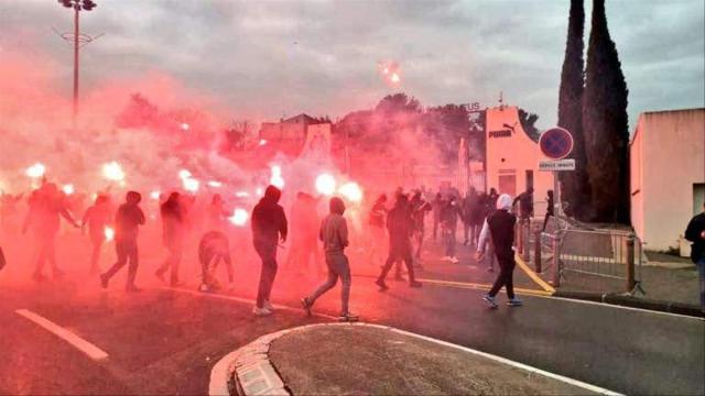 在大门倒下之后,大约有50-100名球迷冲入了基地,并不是全部人。面对试图用催泪弹等手段阻拦他们的安保力量,球迷投掷石块、燃烧瓶,释放烟花。据邻近住宅区的居民说,马赛训练基地就像发生了火灾。红色烟云升起,球迷释放的烟花甚至把一颗柏树点燃冒烟了。